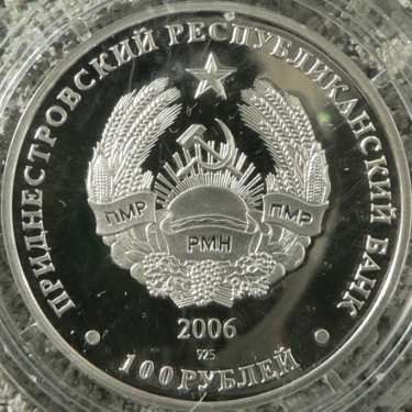 32 mm diameter, 14.14 g, silver 92.5%, flat edge Obverse: denomination "100 RUBLEI" (Cyrillic), coat of arms of the self proclaimed republic of Transnistria (bearing hammer and sickle), inscription "PRIDNESTROVSKII RESPUBLIKANSKII BANK" (in Cyrillic and Russian) meaning "[TRANS] NISTRIAN REPUBLICAN BANK", year 2006, below the silver fineness - 925 | Reverse: a dog represented in Chinese style, inscription GOD OGNENNOI SOBAKI (in Russian, Cyrillic) meaning YEAR OF THE FIERY DOG, year 2006 and a Chinese hierogliph representing the year of the dog