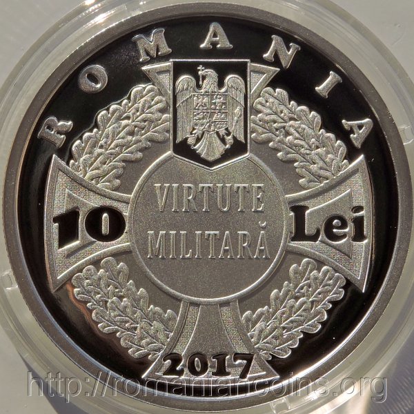 37 mm diameter, 31.103 g, 99.9% silver, reeded edge Obverse: ROMANIA, coat of arms of Romania, face value 50 BANI, year 2017, an image of the war medal Virtutea Militară (Military Virtue) | Reverse: portrait and inscription ECATERINA TEODOROIU