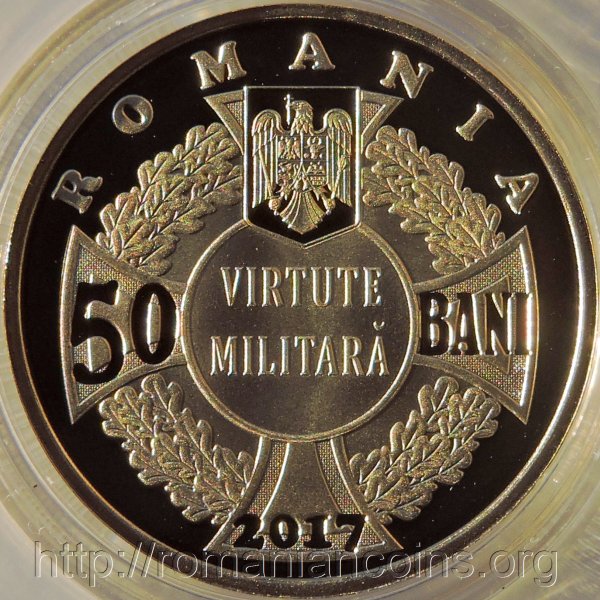 23.75 mm diameter, 6.1 g, brass - 80% copper, 15% zinc, 5% nickel, flat edge, with inscription ROMANIA (two times)Obverse: ROMANIA, coat of arms of Romania, face value 50 BANI, year 2017, an image of the war medal Virtutea Militară (Military Virtue) | Reverse: portrait and inscription ECATERINA TEODOROIU