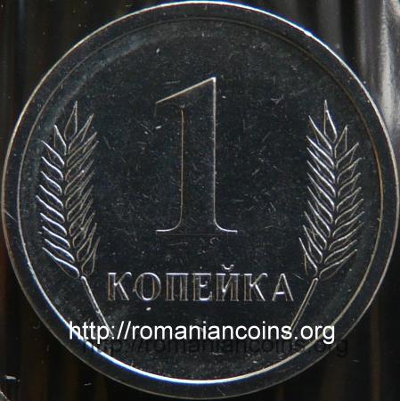 16 mm diameter, 0.65 g, aluminum alloy, flat edge denomination "1 KOPEIKA" (Cyrillic), wheat ears | Coat of arms of the self proclaimed republic of Transnistria (bearing hammer and sickle), inscription "PRIDNESTROVSKAIA MOLDAVSKAIA RESPUBLIKA" (in Cyrillic and Russian) meaning "[TRANS] NISTRIAN MOLDAVIAN REPUBLIC" and year 2000 |