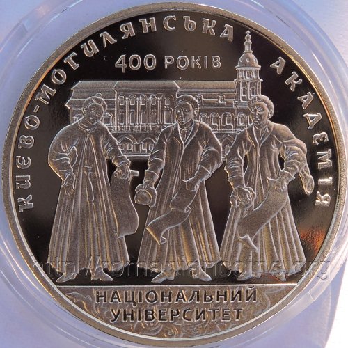 Obverse: the small coat of arms of Ukraine, in the center the coat of arms of the University Mohyla Academy of Kiev, under the coat of arms DVI GRIVNI meaning TWO HRYVNIA, on a ribbon the motto of the Academy (in Latin): TEMPUS FUGIT, ACADEMIA SEMPITERNA, meaning TIME FLOWS, THE ACADEMY IS ETERNAL, at upper-left the logotype of the National Bank of Ukraine, at upper-right year 2015