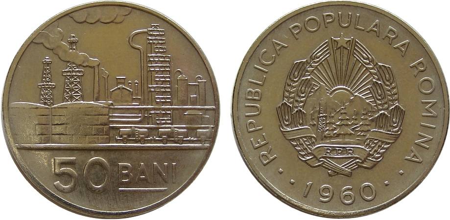 oil refinery, in front three tank cars, at left two oil rigs, cloud above, in exergue face value "50 BANI", the first three letters being underlined | inscription "REPUBLICA POPULARA ROMINA" meaning "ROMANIAN PEOPLE'S REPUBLIC", year 1960 flanked on either sides by a pair of squares, Romanian coat of arms |