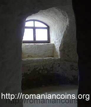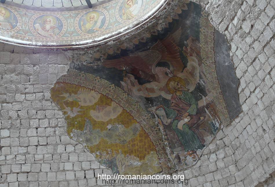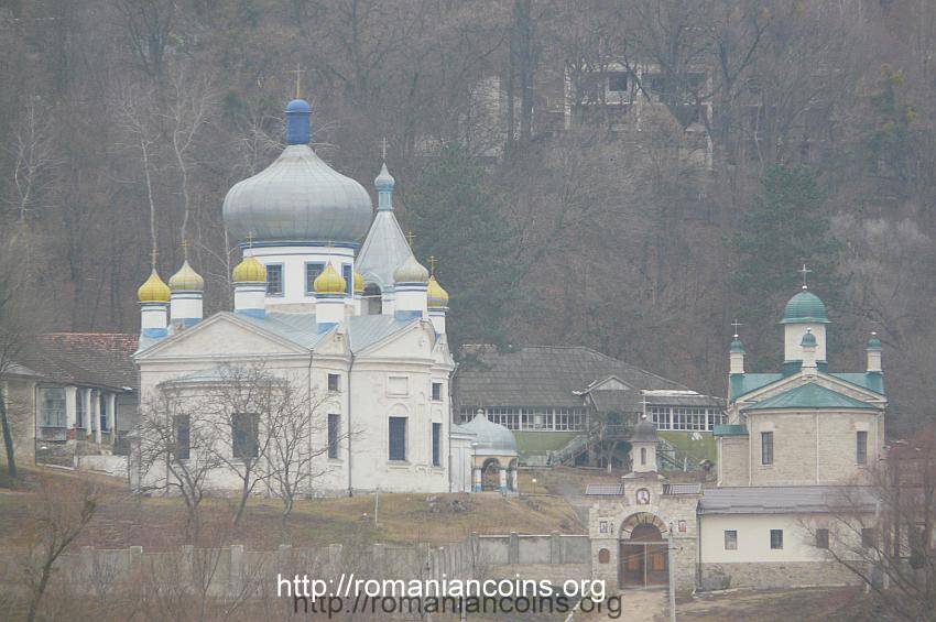 The design of the coin is "generic", not respecting the disposition of the buildings inside the monastery. The church on the left hand side is the "Dormition", while the one on the right is most likely the "Saint Hierarch Nicholas". No angle exists at Condrița out of which the two churches can be seen like this. Taking the "Dormition" church as reference, the "Saint Hierarch Nicholas" church should be placed in front, not behind the former. The buildings behind the "Dormition" church were replaced by conventional forest landscape.