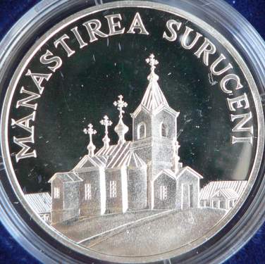 30 mm diameter, 16.5 g, 92.5% silver, flat edge denomination "50 LEI", year 2000, circular inscription REPUBLICA MOLDOVA meaning "REPUBLIC OF MOLDAVIA" and the coat of arms of the Republic of Moldavia | circular inscription "MĂNĂSTIREA SURUCENI" meaning "SURUCENI MONASTERY" and an image of the monastery |