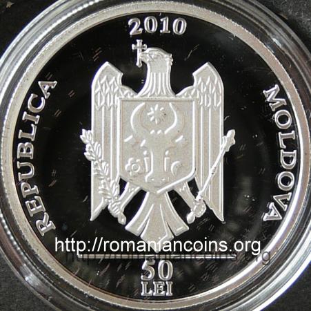 30 mm diameter, 16.5 g, 99.9% silver, grained edge year 2010, circular inscription REPUBLICA MOLDOVA meaning "REPUBLIC OF MOLDAVIA" and the coat of arms of the Republic of Moldavia, in exergue horizontal line and denomination "50 LEI" |