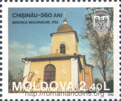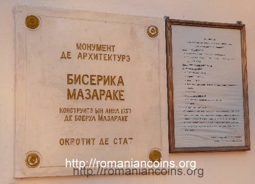 an old image of the church and inscriptions "sec.XVIII" and "BISERICA MĂZĂRACHE DIN CHIȘINĂU" meaning "18TH CENTURY" and "MĂZĂRACHE CHURCH FROM CHIȘINĂU"