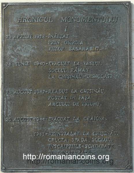 After the Soviet ultimatum in 1940 the statue was transported to Vaslui, where it stood over to August 1942 (having been installed next to Saint John church, founded by the great voivod himself), when it was retrieved to Chișinău. In 1944 the statue was evacuated again, this time to Craiova. In 1945 sculptor Claudia Cobizev (1905-1995) from Chișinău, at the time translator at the Allied (in fact, Soviet) Control Commission, stumbled upon the statue of Stephen in a park in Craiova and warned the Soviet authorities. The statue returned thusly to Chișinău, as declared to be a cultural good smuggled out out of USSR. The cross, sword and inscriptions were changed and denatured. In 1971 a decision was taken to restore it and install a new pedestal, that would have corresponded to the idea of the author (with the exception of the Moldavian coat of arms and acanthus leaves). In 1972 the emplacement of the monument was changed (18 meters deep inside the park). At August 31st 1990 the monument of Stephen the Great has been returned to its historical emplacement chosen by Alexandru Plămădeală. Images dating from the restoration of the monument to its original state can be seen here. The initial inscriptions were reestablished.