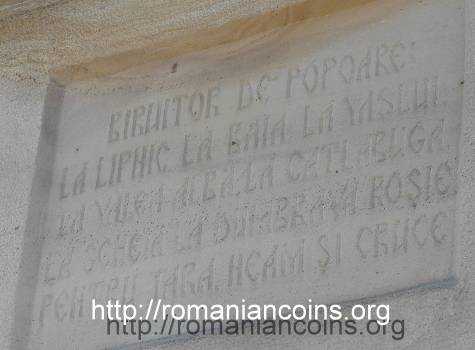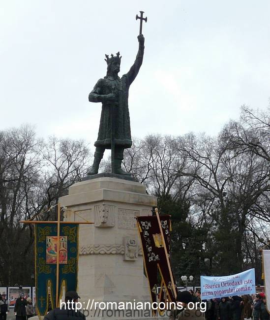 The voivod countenance imagined by Plămădeală is heedful, harrowed with age and duty to posterity, thus resulting into an original concept, currently present on all banknotes of the Republic of Moldova in circulation. It is one of the most beautiful statues dedicated to Stephen the Great and the only one displaying the great Romanian as giving precedence to the cross with respect to the sword, placing by allegory the later in the service of the former. Poem "Suveranitate [Sovereignty] of patriot and poet Ion Hadîrcă, put to song in 1990 by Ion and Doina Aldea-Teodorovici, makes an indirect address, of deep significance, to this allegoric, original aspect of the statue of Plămădeală: "Spada-n piatră, neclintită-i vatra, / Crucea-n ceruri ară adevărul" [Sword onto stone, unfaltering is the hearth, / Cross in heavens ploughs the truth].