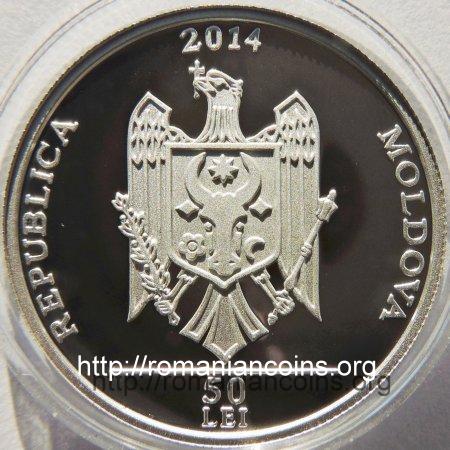 28 mm diameter, 13 g, 99.9% silver, grained edge year 2014, circular inscription REPUBLICA MOLDOVA meaning "REPUBLIC OF MOLDAVIA" and the coat of arms of the Republic of Moldavia, in exergue horizontal line and denomination "50 LEI" |
