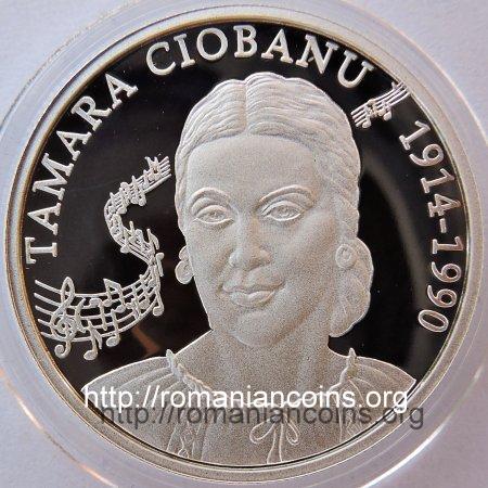 Tamara Ciobanu was, as the coin's certificate of authenticity restates, "one of the first exponents of the Romanian song in the Republic of Moldova from the second half of the 20th century who, through her talent and vocation, through the traditional folk music, managed to bring about the rebirth of national feelings”. She sang opera also, but her greatest success was obtained as traditional folk music singer. In the countries formerly belonging to USSR, Tamara Ciobanu is also known under her Russianized name - Ceban.