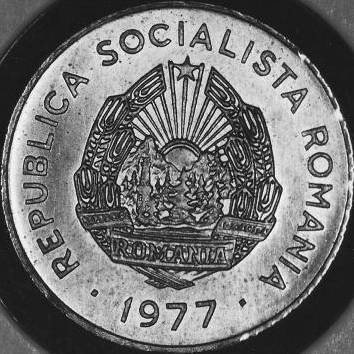 face value "5 LEI", laurel wreath, open book, gear wheel, two wheat ears, smoke flue and shape resembling an industrial background, the Endless Column of Tîrgu-Jiu | inscription "REPUBLICA SOCIALISTA ROMANIA" meaning "SOCIALIST REPUBLIC OF ROMANIA, Romanian coat of arms, year 1977 between two squares |