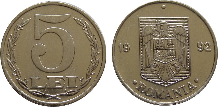 21 mm diameter, 3.2 grams, nickel, flat edge denomination "5 LEI", laurel wreath | · ROMANIA ·, Romanian coat of arms, year 1992, globule above the coat of arms |
