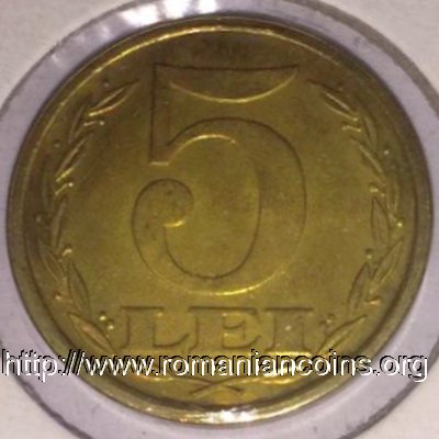 21 mm diameter, ? grams, brass, flat edge denomination "5 LEI", laurel wreath | ROMANIA, year 1992, three oak leaves, initials CD standing for Constantin Dumitrescu, the engraver of the coin |