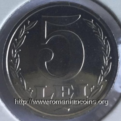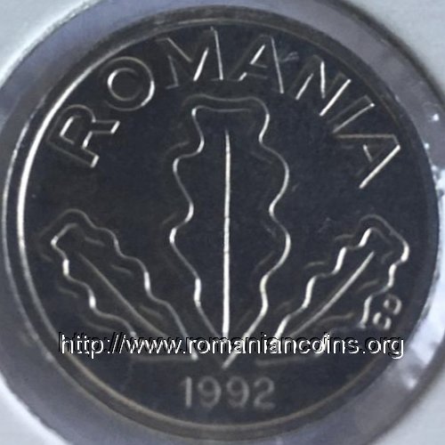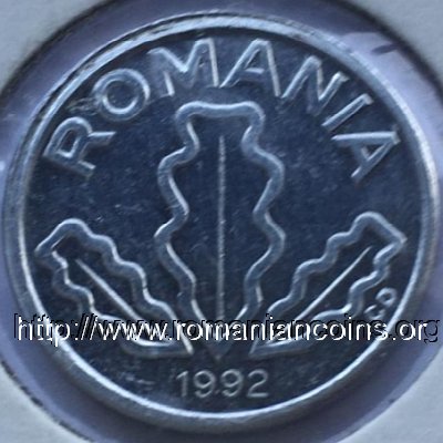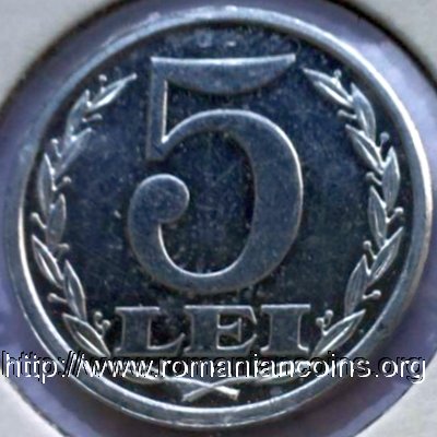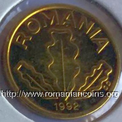 21 mm diameter, ? grams, aluminum, flat edge denomination "5 LEI", laurel wreath | ROMANIA, year 1992, three oak leaves, initials CD standing for Constantin Dumitrescu, the engraver of the coin |
