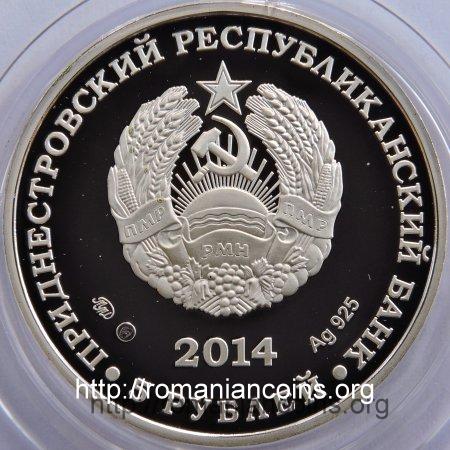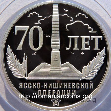 32 mm diameter, 14.148 g, silver 92.5%, flat edge Obverse: denomination "5 RUBLEI" (Cyrillic), coat of arms of the self proclaimed republic of Transnistria (bearing hammer and sickle), inscription "PRIDNESTROVSKII RESPUBLIKANSKII BANK" (in Cyrillic and Russian) meaning "[TRANS] NISTRIAN REPUBLICAN BANK", year 2014, at left mintmarks (MMD and a head of a Russian woman - possibly the Russian hallmark for silver jewelry), at right the silver fineness - Ag925 | Reverse: the commemorative monument of the Iași-Chișinău Operation erected at Chițcani, between two laurel branches, inscription "70 LET IASSKO-KIȘINEVSKOI OPERAȚII" meaning "70 YEARS SINCE THE IAȘI-CHIȘINĂU OPERATION", in exergue a double five-pointed star