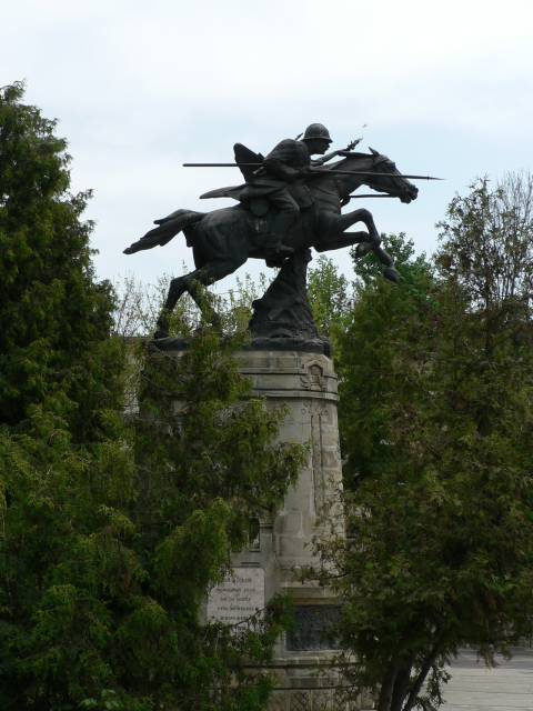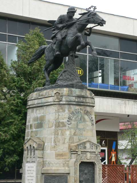 | statuia - mausoleu a eroilor Diviziei 2 Cavalerie, operă a sculptorului Ioan C. Dimitriu-Bîrlad, a fost inaugurată în 1927, în aceeași zi cu statuia României Mari; cavaleriștii acestei divizii s-au acoperit de nepieritoare glorie în eroica șarjă de la Prunaru, în primul război mondial; numele luptelor ce au fost martelate erau - se zice - Nistru și Tisa - Budapesta (erau scrise pe părțile laterale ale monumentului) |