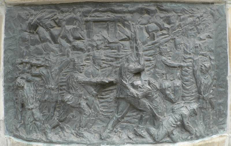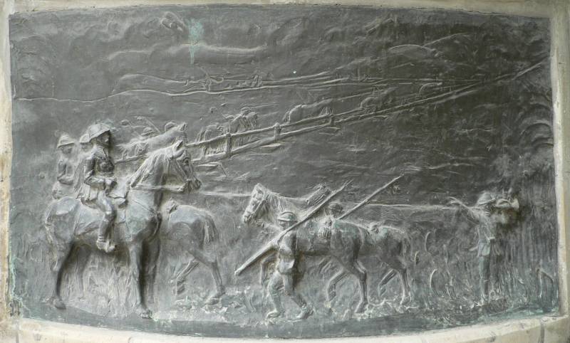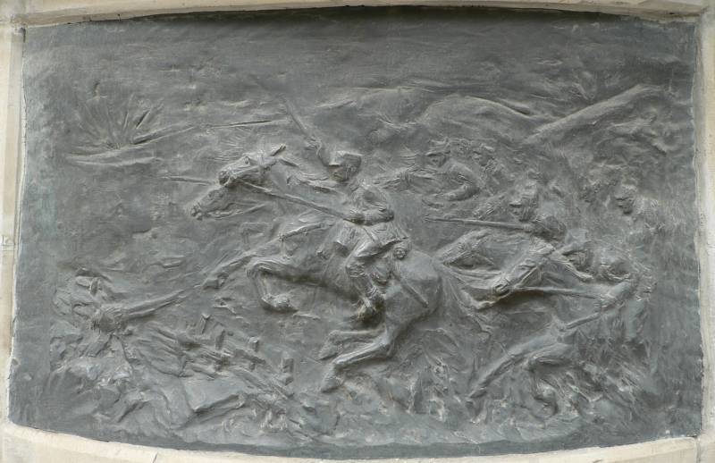 | basorelief pe soclul statuii - mausoleu a eroilor Diviziei 2 Cavalerie, reprezentînd un moment al luptelor de la Măgheruș sau de la Oituz, unde cavaleriștii au luptat descălecați |