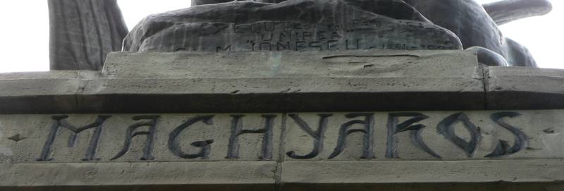 | inscripție în partea din spate a soclului, amintind de participarea soldaților Diviziei 2 cavalerie la luptele de la Măgheruș; deasupra vedem și unde a fost turnată statuia: Executat în fabrica Unirea” M. Ionescu - Iași - 1926 |