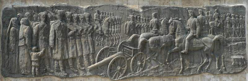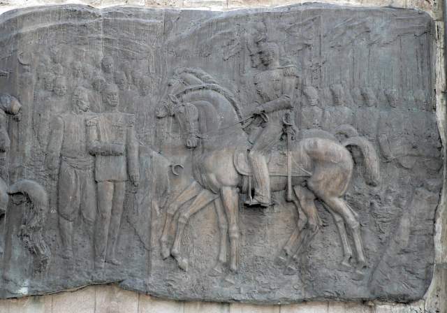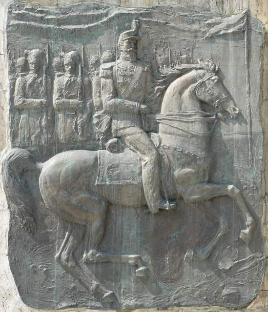 | basorelief pe soclul statuii Independenței - domnitorul Carol I trece în revistă oștile; dorobanții, cu pene de curcan la căciulă, prezintă onorul |