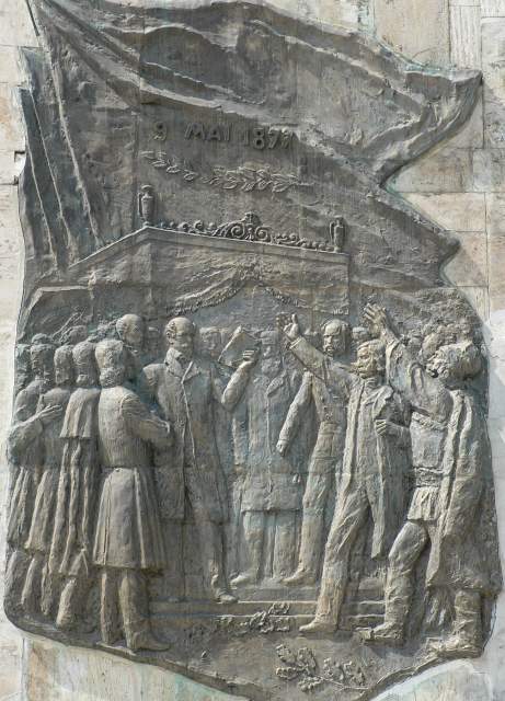 | basorelief pe soclul statuii Independenței - proclamarea independenței în parlament, pe 9 mai 1877; Mihail Kogălniceanu citește declarația de independență, aclamat de deputați și de popor: "În stare de rezbel, cu legăturile rupte, ce suntem? Suntem independenți, suntem națiune de sine stătătoare. (Aplauze.) Avem domn de sine stătător. (Aplauze.)" |