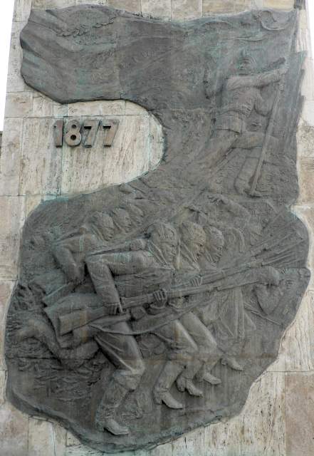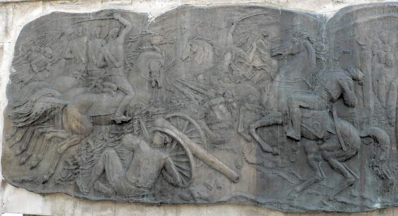 | basorelief pe soclul statuii Independenței - scenă de luptă - trupele române sînt victorioase (deși în prim plan sînt cavaleriștii, trupele de infanterie fiind în planul secund, în realitate rolul jucat de cavaleria română în război a fost mult mai puțin important decît rolul infanteriei) |