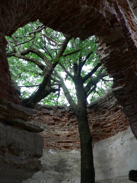 | în interiorul bisericii - copacii trec prin fosta boltă |
