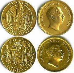 21 mm diametru, 6.5 g, aur 90%, cupru 10%, margine cu zimți valoarea nominală 20 LEI, ROMANIA, anul 19 39 scris de o parte și de alta (ultimul 9 lipsește), o acvilă ținînd o cruce în cioc, cu aripile deschise, așezată pe stema României | legenda CAROL II REGELE ROMANILOR și efigia lui Carol al II-lea spre dreapta |