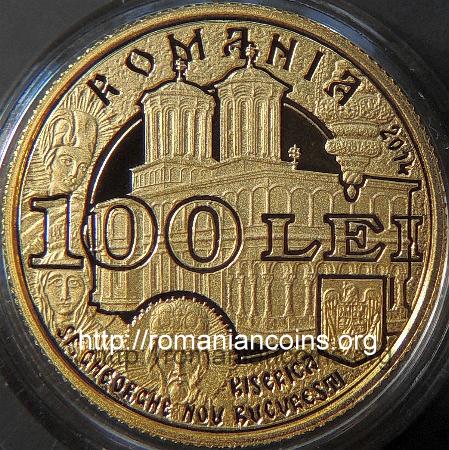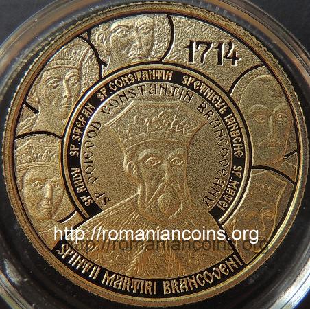 21 mm diametru, 6.452 g, 99.9% aur, margine cu zimți Avers: ROMANIA, anul 2014, valoarea nominală 100 LEI, stema României, biserica Sfîntul Gheorghe Nou din București, în stînga fragmente din trei icoane cu Sfîntul Gheorghe, Sfînta Paraschiva și Sfîntul Nicolae (biserica este închinată acestor sfinți), în dreapta candela de deasupra mormîntului lui Constantin Brâncoveanu (acesta a fost înmormîntat în biserică), inscripția BISERICA SF. GHEORGHE NOU BUCURESTI | Revers: fragmente din tabloul votiv al bisericii Sfîntul Gheorghe Nou din București, cu chipurile Sfinților Martiri Brâncoveni, anul martiriului - 1714, în care a avut loc martiriul, inscripțiile SF. RADU SF. STEFAN SF. CONSTANTIN SFETNICUL IANACHE SF. MATEI și SF. VOIEVOD CONSTANTIN BRANCOVEANU, în exergă inscripția SFINTII MARTIRI BRANCOVENI