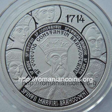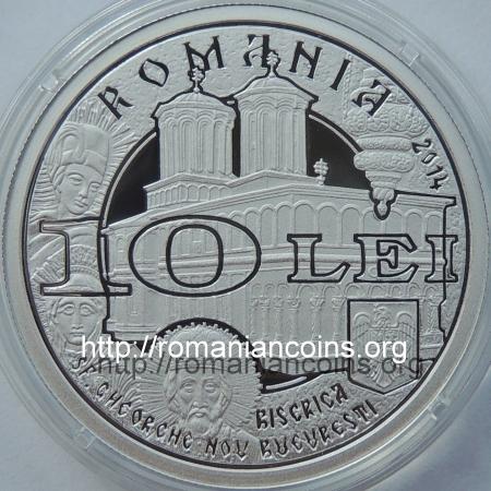 37 mm diametru, 31.103 g, 99.9% argint, margine cu zimți Avers: ROMANIA, anul 2014, valoarea nominală 10 LEI, stema României, biserica Sfîntul Gheorghe Nou din București, în stînga fragmente din trei icoane cu Sfîntul Gheorghe, Sfînta Paraschiva și Sfîntul Nicolae (biserica este închinată acestor sfinți), în dreapta candela de deasupra mormîntului lui Constantin Brâncoveanu (acesta a fost înmormîntat în biserică), inscripția BISERICA SF. GHEORGHE NOU BUCURESTI | Revers: fragmente din tabloul votiv al bisericii Sfîntul Gheorghe Nou din București, cu chipurile Sfinților Martiri Brâncoveni, anul martiriului - 1714, în care a avut loc martiriul, inscripțiile SF. RADU SF. STEFAN SF. CONSTANTIN SFETNICUL IANACHE SF. MATEI și SF. VOIEVOD CONSTANTIN BRANCOVEANU, în exergă inscripția SFINTII MARTIRI BRANCOVENI