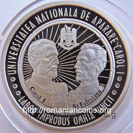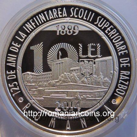 37 mm diametru, 31.103 g, 99.9% argint, margine cu zimți Avers: valoarea nominală 10 LEI, stema României, anul 2014, ROMANIA, în dublu cerc torsadat interior anul 1889, o imagine a clădirii Academiei Militare, în care funcționează Universitatea Națională de Apărare, în exterior inscripția 125 DE ANI DE LA INFIINTAREA SCOLII SUPERIOARE DE RAZBOI, cu cîte o roză la început și la sfîrșit | Revers: în dublu cerc torsadat interior bustul regelui și cel al șeful Marelui Stat Major pe fond de raze, inscripțiile Carol I și St. Falcoianu, sus stema școlii, inscripțiile UNIVERSITATEA NATIONALA DE APARARE CAROL I și LABOR IMPROBUS OMNIA VINCIT, separate prin două grupuri a cîte trei roze