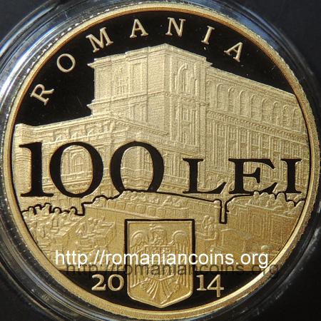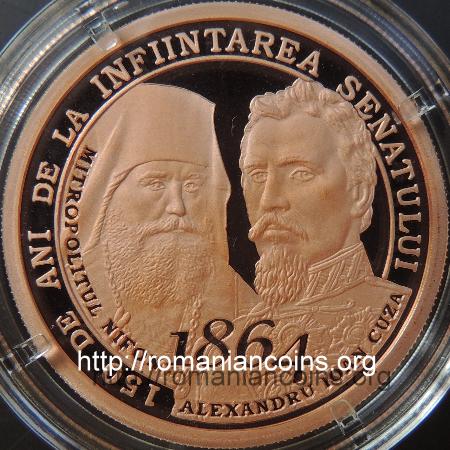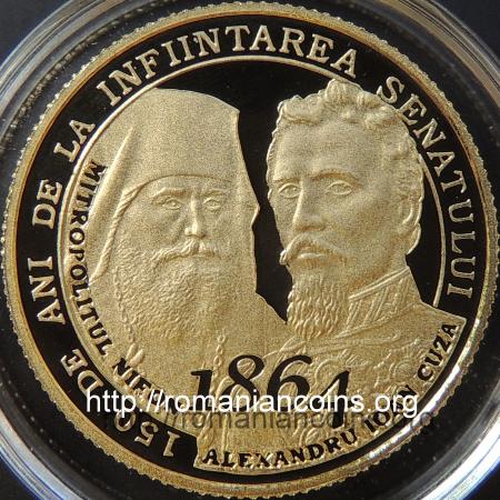 21 mm diametru, 6.452 g, 99.9% aur, margine cu zimți Avers: ROMANIA, valoarea nominală 100 LEI, stema României, anul 2014, sus Palatul Parlamentului din București, jos o imagine cu o ședință a Senatului | Revers: portretele și numele domnitorului Alexandru Ioan Cuza și al mitropolitului Nifon (mitropolitul a fost și primul președinte al Senatului) - ALEXANDRU IOAN CUZA și MITROPOLITUL NIFON, inscripția 150 DE ANI DE LA INFIINTAREA SENATULUI și anul 1864