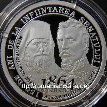 37 mm diametru, 31.103 g, 99.9% argint, margine cu zimți Avers: ROMANIA, valoarea nominală 10 LEI, stema României, anul 2014, sus Palatul Parlamentului din București, jos o imagine cu o ședință a Senatului | Revers: portretele și numele domnitorului Alexandru Ioan Cuza și al mitropolitului Nifon (mitropolitul a fost și primul președinte al Senatului) - ALEXANDRU IOAN CUZA și MITROPOLITUL NIFON, inscripția 150 DE ANI DE LA INFIINTAREA SENATULUI și anul 1864