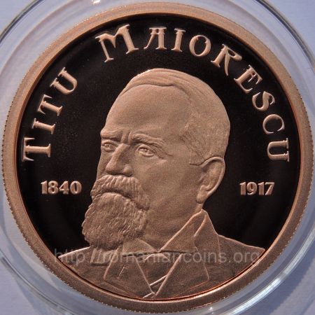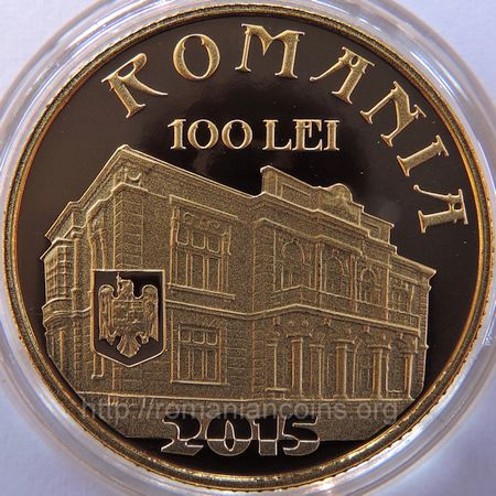 21 mm diametru, 6.454 g, 90% aur, margine cu zimți Avers: ROMANIA, valoarea nominală 100 LEI, stema României, anul 2015, o imagine cu Casa Pogor din Iași | Revers: bustul lui Maiorescu, inscripția TITU MAIORESCU, anii 1840 și 1917