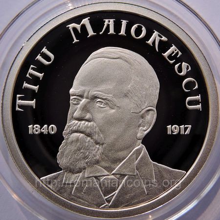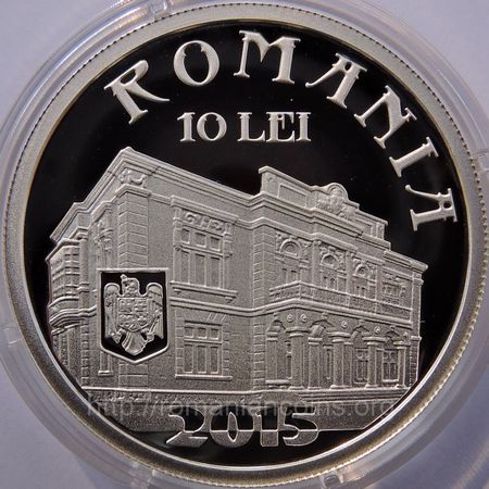 37 mm diametru, 31.103 g, 99.9% argint, margine cu zimți Avers: ROMANIA, valoarea nominală 10 LEI, stema României, anul 2015, o imagine cu Casa Pogor din Iași | Revers: bustul lui Maiorescu, inscripția TITU MAIORESCU, anii 1840 și 1917