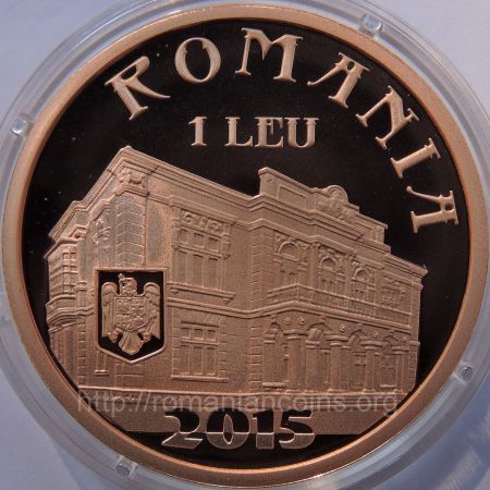 37 mm diametru, 23.5 g, tombac cuprat, margine cu zimți Avers: ROMANIA, valoarea nominală 1 LEU, stema României, anul 2015, o imagine cu Casa Pogor din Iași | Revers: bustul lui Maiorescu, inscripția TITU MAIORESCU, anii 1840 și 1917