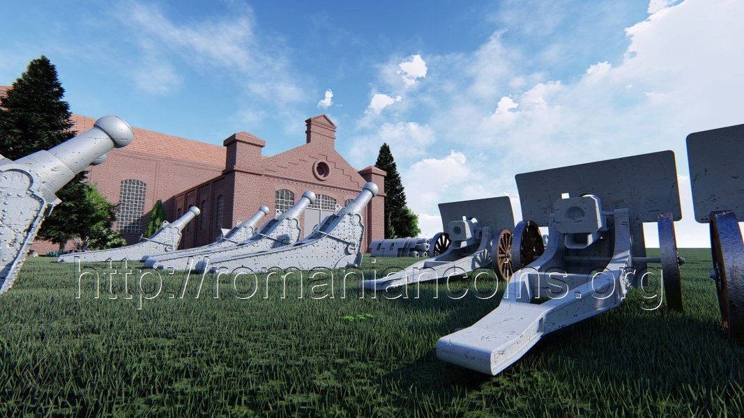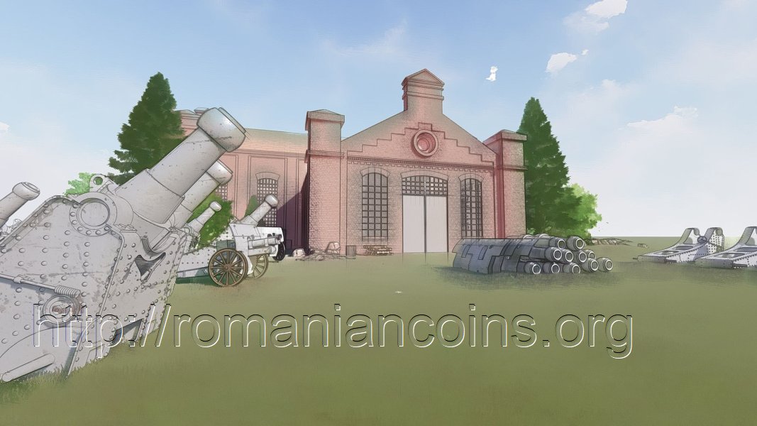 - Uzinele Nicolina în perioada producerii de obuziere Krupp-Iași, cu afeturi terminate și plasate în fața corpului principal, realistă;