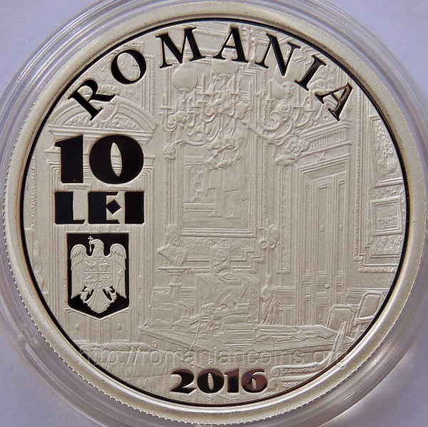 37 mm diametru, 31.103 g, 99.9% argint, margine cu zimţi Avers: ROMANIA, valoarea nominală 10 LEI, stema României, anul 2016, Cabinetul Guvernatorului - sală din palatul BNR (imagine de epocă) | Revers: efigiile celor trei guvernatori BNR omagiaţi, inscripţia I. CAMPINEANU - M. MANOILESCU - I. LAPEDATU GUVERNATORI AI BANCII NATIONALE A ROMANIEI