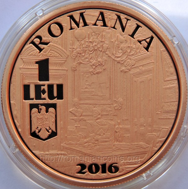 37 mm diametru, 23.5 g, tombac cuprat, margine cu zimţi Avers: ROMANIA, valoarea nominală 1 LEU, stema României, anul 2016, Cabinetul Guvernatorului - sală din palatul BNR (imagine de epocă) | Revers: efigiile celor trei guvernatori BNR omagiaţi, inscripţia I. CAMPINEANU - M. MANOILESCU - I. LAPEDATU GUVERNATORI AI BANCII NATIONALE A ROMANIEI