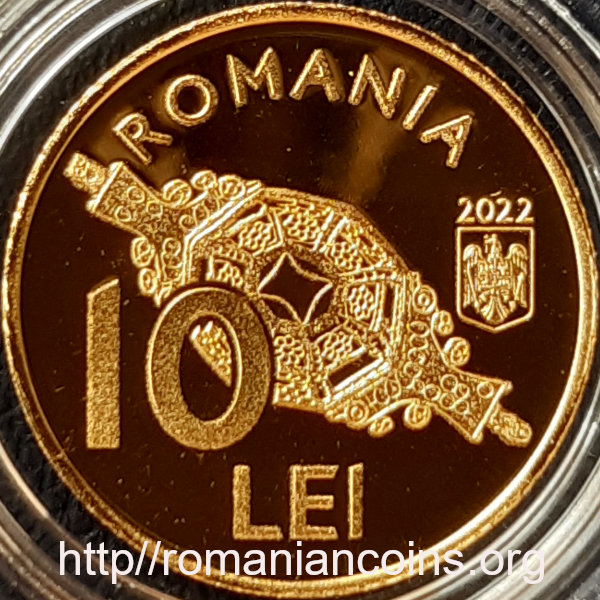 10 lei aur 2022 - tezaurul de la Pietroasa - vasele poligonale - seria Istoria aurului |