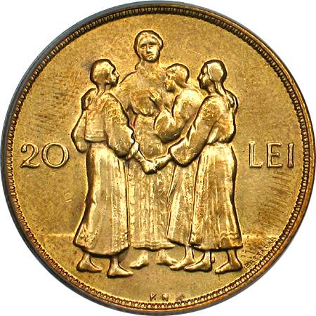 Relativ rară - în ciuda tirajului mare - și scumpă, e aproape imposibil de găsit în stare bună. Între numismați este cunoscută ca Hora sau Moneda cu hora. Faptul că practic nu se poate găsi nimeni capabil să citească această monedă este o situație întru totul jenantă pentru numismați și numismatica românească. Cele patru personaje feminine nu sînt surprinse jucînd, așa cum s-a găsit o explicație facilă (Hora), care s-a și împămîntenit, ci este vorba de Alegoria României Mari.