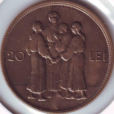 valoarea nominală 20 LEI, patru țărănci în costum popular și inscripția BASSARAB în dreapta jos, de-a lungul circumferinței (însemn al gravorului Costache Bassarab), cerc perlat exterior | inscripția MIHAI I REGELE ROMANIEI, anul 1930 și efigia regelui spre stînga, cerc perlat exterior Tiraj: 50.000.000 piese |