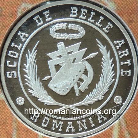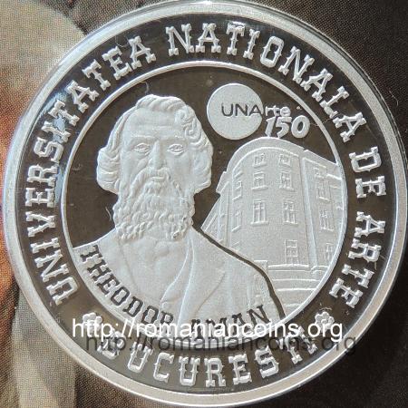 28 mm diametru, 15.5 g, 80% argint, margine netedă Avers: în cerc liniar interior bustul pictorului Theodor Aman și numele acestuia - THEODOR AMAN, o imagine a clădirii Universității Naționale de Arte, sigla universității (UNArte, primele trei litere într-un cerc), numărul anilor trecuți de la înfiițare - 150, inscripția circulară UNIVERSITATEA NATIONALA DE ARTE BUCURESTI, numele orașului fiind delimitat de rouă roze cu cîte șase petale | Revers: o imagine a unei medalii desenate de Theodor Aman pentru Școala de Belle Arte: în cerc liniar interior o compoziție cu ramuri de finic, cunună de lauri, instrumente de pictură, sculptură și arhitectură (sugerînd artele frumoase), în exterior inscripția SCOALA DE BELLE ARTE ROMANIA, numele țării fiind delimitat de rouă roze cu cîte șase petale