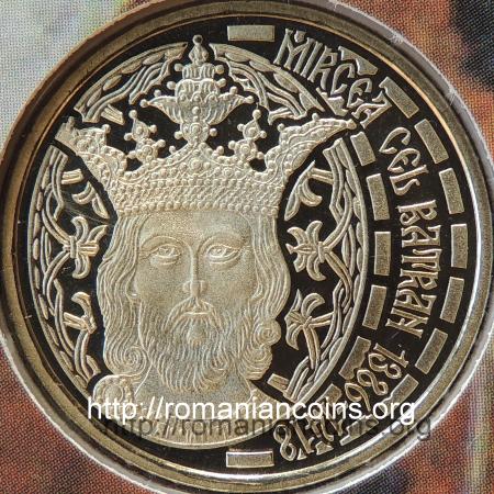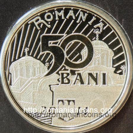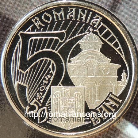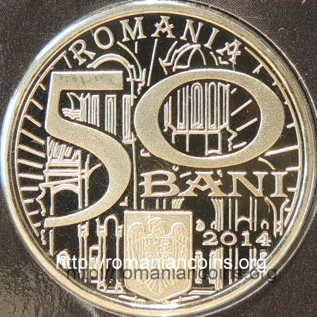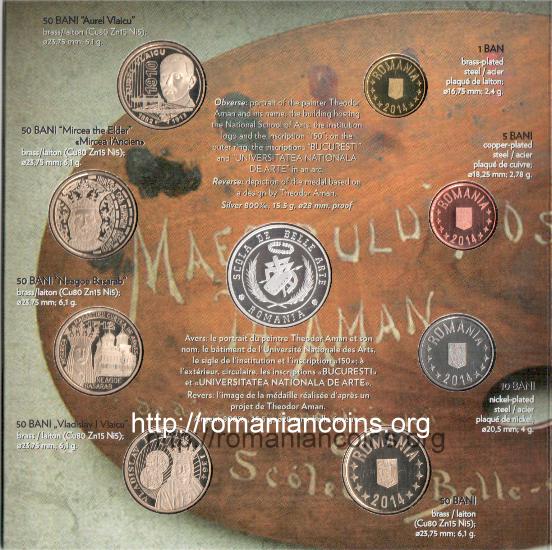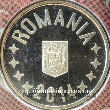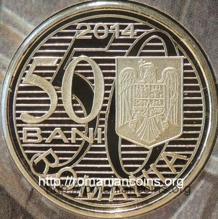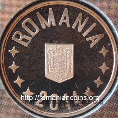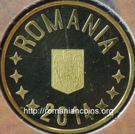Setul din 2014 cuprinde noile monede de 1 ban, 5, 10 și 50 de bani intrate în circulație la 1 iulie 2005. Toate monedele sînt de calitate proof (sau poate like-proof - pe cartonul setului se precizează că medalia are calitatea proof, dar despre monede nu se spune de fapt nimic). Mai conține moneda omagială de 50 de bani dedicată lui Aurel Vlaicu și avionului său, varianta proof cu fețele amplasate medalistic, cu anul 2014. Moneda a fost emisă inițial în anul 2010 pentru a aniversa 100 de ani de la primul zbor al lui Aurel Vlaicu. Există trei variante de 50 bani Vlaicu 2010: una de circulație, de calitate obișnuită, una proof cu fețele amplasate medalistic (în componența setului de monetărie 2010) și una proof cu orientarea fețelor de tip monedă. Ca urmare, piesele de 50 bani Vlaicu din 2011, 2012, 2013 și 2014 ce intră în componența seturilor de monetărie din anii respectivi sînt apariții oarecum ciudate, fiindcă ar rezulta că aniversează 101, 102, 103 și 104 ani de la primul zbor! Setul conține o monedă de 50 de bani Mircea cel Bătrîn, cu fețele plasate medalistic, realizată la calitate proof. Piesa de 50 bani 2011 Mircea cel Bătrîn a fost bătută pentru a aniversa 625 de ani de la urcarea pe tron a voievodului muntean. Piesa există în varianta de circulație, de calitate obișnuită. Ar rezulta că monedele din 2012, 2013 și 2014 aniversează 626, 627 și 628 de ani de la eveniment! Setul conține și o monedă de 50 de bani Neagoe Basarab, cu fețele plasate medalistic, realizată la calitate proof. Piesa de 50 bani 2012 Neagoe Basarab există în varianta de circulație, de calitate obișnuită. Ar rezulta că monedele din 2013 și 2014 aniversează 501 și 502 ani de la eveniment! Setul conține și o monedă de 50 de bani Vladislav Vlaicu, cu fețele plasate medalistic, realizată la calitate proof. Piesa de 50 bani 2014 Vladislav Vlaicu există în varianta de circulație, de calitate obișnuită. |