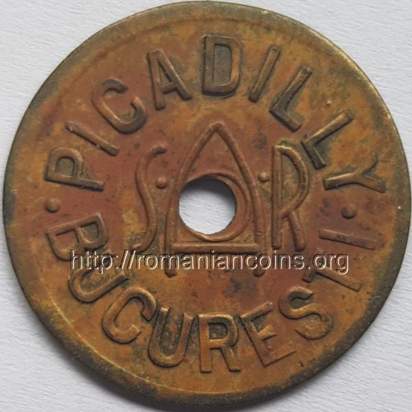 | 21.5 mm, 2.23 g, brass, with central hole PICADILLY · BUCURESTI · S·A·R | BUN · PENTRU · 1 TAP meaning GOOD FOR 1 BOCK (meaning billy-goat, Romanian for 0.3 liter draft, about half pint) |