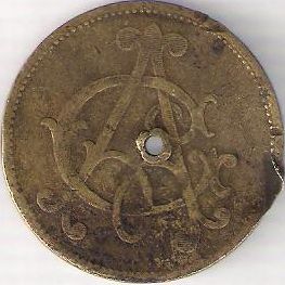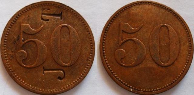 ? mm, alamă valoarea 50, poansonat J T, cerc perlat exterior | valoarea 50, cerc perlat exterior |