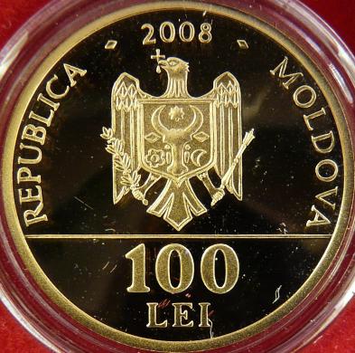 24 mm diameter, 7.8 g, 99.9% gold, flat edge year 2008, circular inscription REPUBLICA MOLDOVA meaning "REPUBLIC OF MOLDAVIA" and the coat of arms of the Republic of Moldavia, in exergue denomination "100 LEI" |