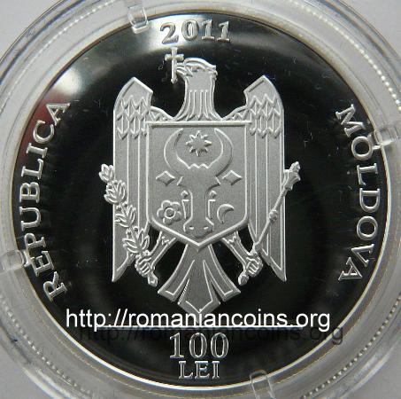 37 mm diameter, 31.1 g, 99.9% silver, grained edge year 2011, circular inscription REPUBLICA MOLDOVA meaning "REPUBLIC OF MOLDAVIA" and the coat of arms of the Republic of Moldavia, in exergue horizontal line and denomination "100 LEI" |