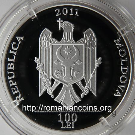 37 mm diameter, 31.1 g, 99.9% silver, grained edge year 2011, circular inscription REPUBLICA MOLDOVA meaning "REPUBLIC OF MOLDAVIA" and the coat of arms of the Republic of Moldavia, in exergue horizontal line and denomination "100 LEI" |