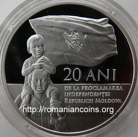 a lad sitting on his father's shoulders, in backgroung the flag of the Republic of Moldavia, inscription "20 ANI DE LA PROCLAMAREA INDEPENDENȚEI REPUBLICII MOLDOVA" meaning "20 YEARS SINCE THE PROCLAMATION OF THE INDEPENDENCE" Issuing date: 1st of July 2011 Mintage: 1000 coins |