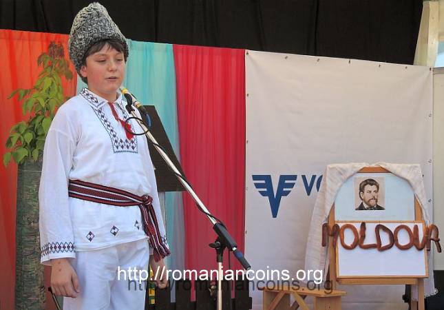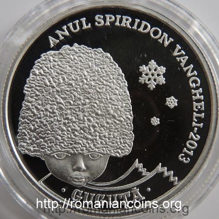 Writer and translator Spiridon Vangheli was born in 1932 at Grinăuți, in the county of Bălți in România (today, the place belongs to the rayon of Rîșcani in the Republic of Moldova). The character of Guguță himself was born in 1967, when children's book Isprăvile lui Guguță [Feats of Guguță] appeared. This was followed by volumes Guguță căpitan de corabie [Guguță Ship Captain] (1979) and Guguță și prietenii săi [Guguță and His Friends] (1994), imposing Guguță as a character dearly beloved by children. In the story "Căciula lui Guguță" [Guguță's Woolen Hat], little Guguță has received from his father a rather large woolen hat, which thence became a symbol of the character. During winter Guguță defended the village children against the cold withal, by magically accommodating them underneath it. The woolen hat had the feature to fit whole children under it according to needs, two children, seven children, the entire village at the end. On the coin, Guguță was represented, logically, as wearing the big hat. The Guguță books were translated into 40 languages, being published in millions (8 millions, after some sources).